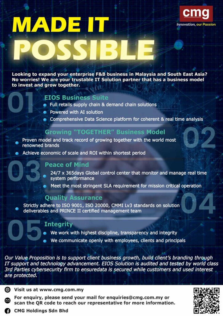 EIOS is an enterprise F&B retail supply chain solution that capitalises on artificial intelligence, data science, and digital innovation. It aims is to provide complete business and operation visibility. EIOS was developed using the latest technology that supports multiple ordering channels and social platforms under one integrated solution.